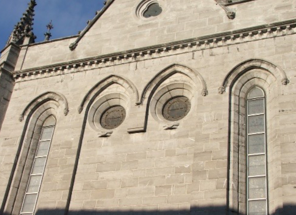 Extérieurement, les pierres semblent chanter sous le soleil, mettant en relief l'architecture néo-gothique avec les vitraux en relief, moulures et archivoltes...